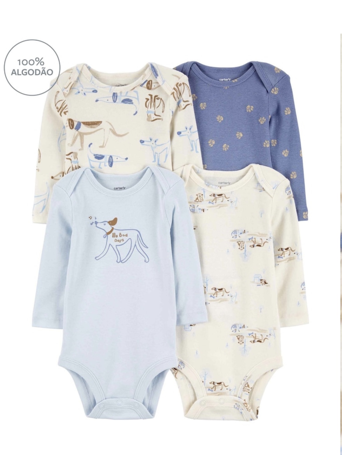 Kit body 4 peças multicor | Carter's. os bodys são perfeito para complementar e dar opções para seus pequenos. Feito de algodão, o kit conta com bodies variados e estampas diversas. Eles possuem modelagem de mangas longas, ombros transpassados e abotoamento entrepernas. Um charme!